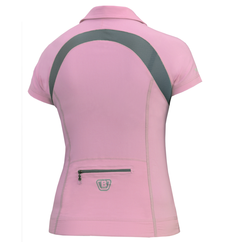The women's cycling shirt was made of elastic STRETCH fabric. There is a classic collar with press studs. Around the forearms a grey mesh inset was used to provide better ventilation. There is a back zippered pocket. A slim-fit cut compliments a feminine figure. At the front, there is an embroidered logo element. Flat seams prevent skin irritations. Reflective elements located at the front and back add high visibility whilst on the road. It's comfortable. Designed for warm days.